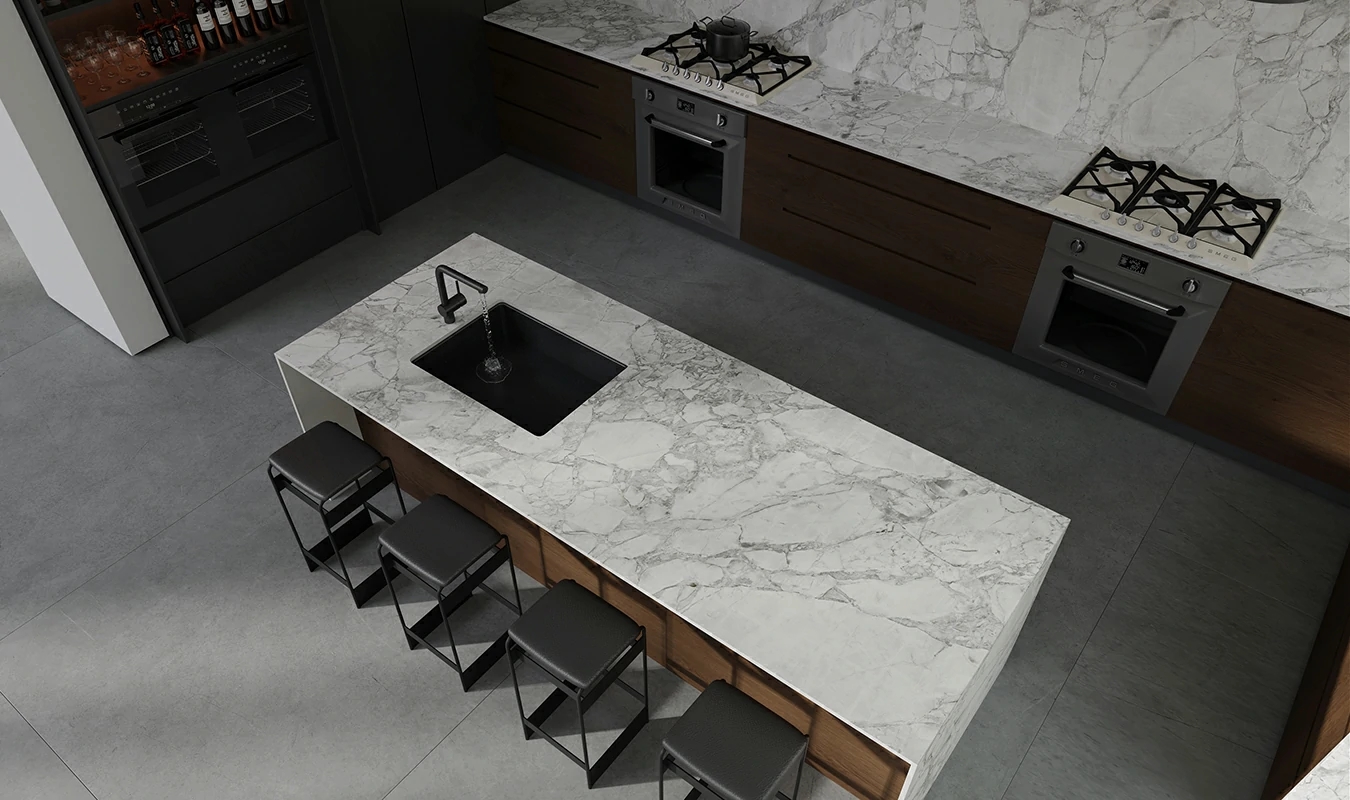 1. Kitchen Countertops: One of the most common applications of sintered stones in residential settings is kitchen countertops. The high heat resistance, scratch resistance, and non-porous nature of sintered stone make it an ideal material for kitchen surfaces. It can withstand hot pots and pans, resist knife cuts, and prevent staining from food and beverages, ensuring a long-lasting and hygienic surface.